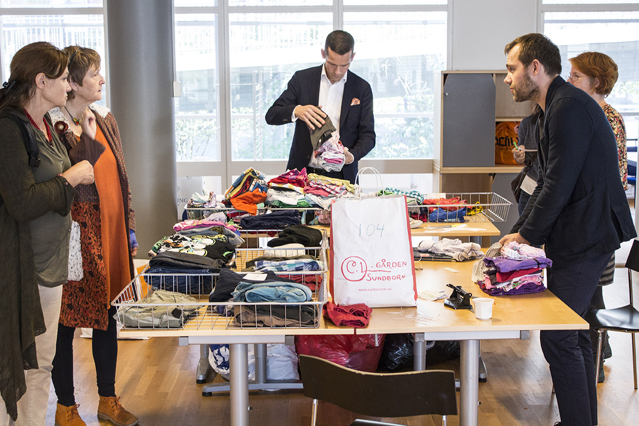 Några gäster är med och packar paket med kläder i samma storlek som skänks till behövande.