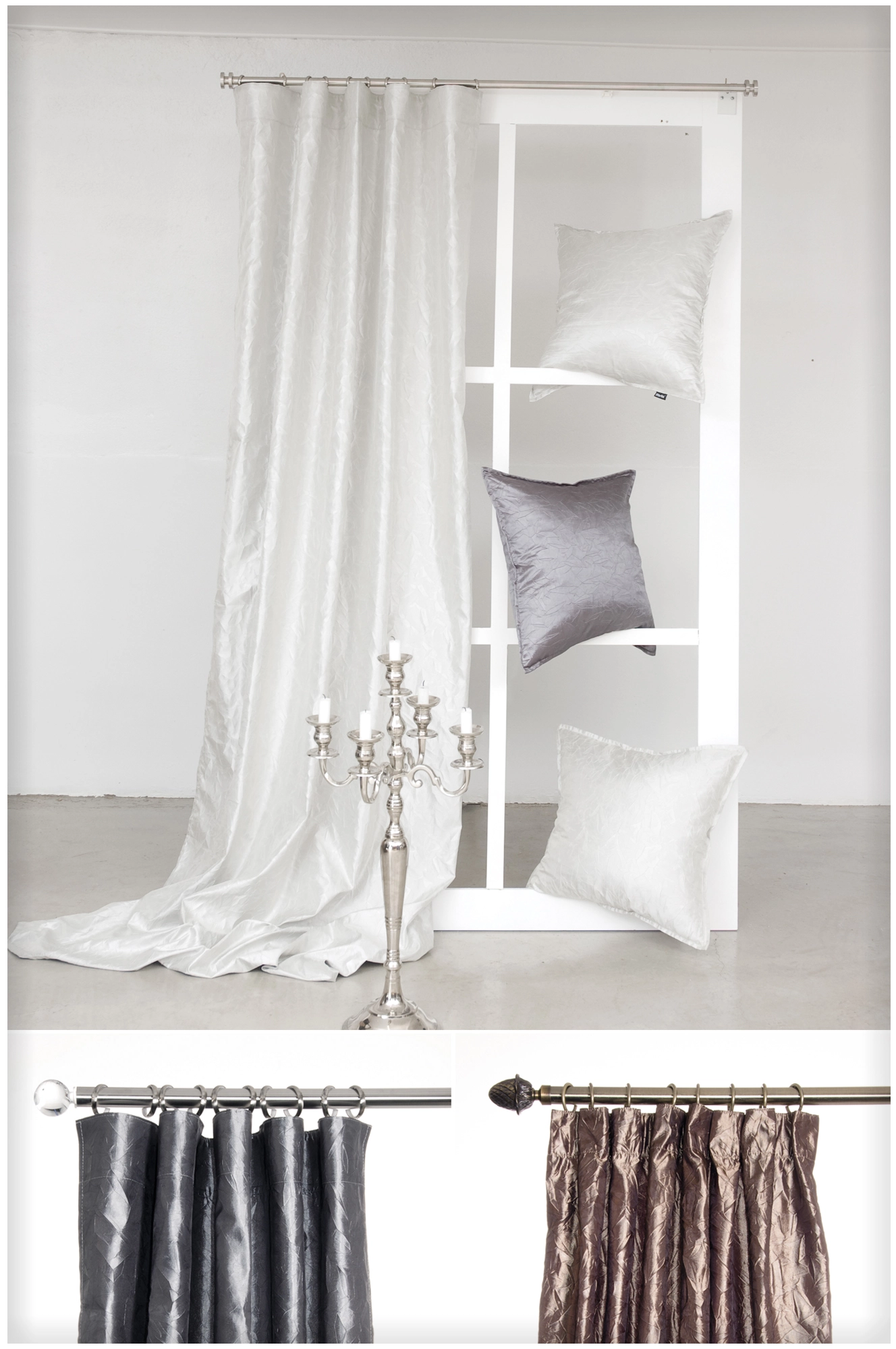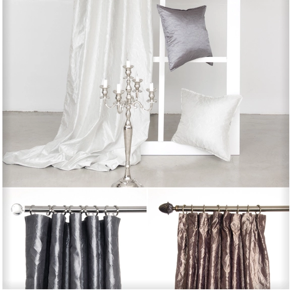 Prisma är en gardin i glansigt material med en skrynklig effekt. Svart foder på baksidan gör att gardinen dämpar ljuset bra. Prisma är därför en lämplig gardin i sovrummet eller tv-rummet där du vill dämpa ljuset.