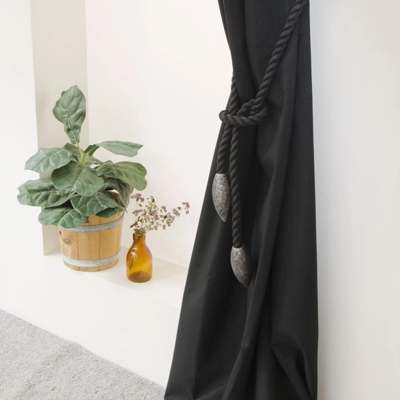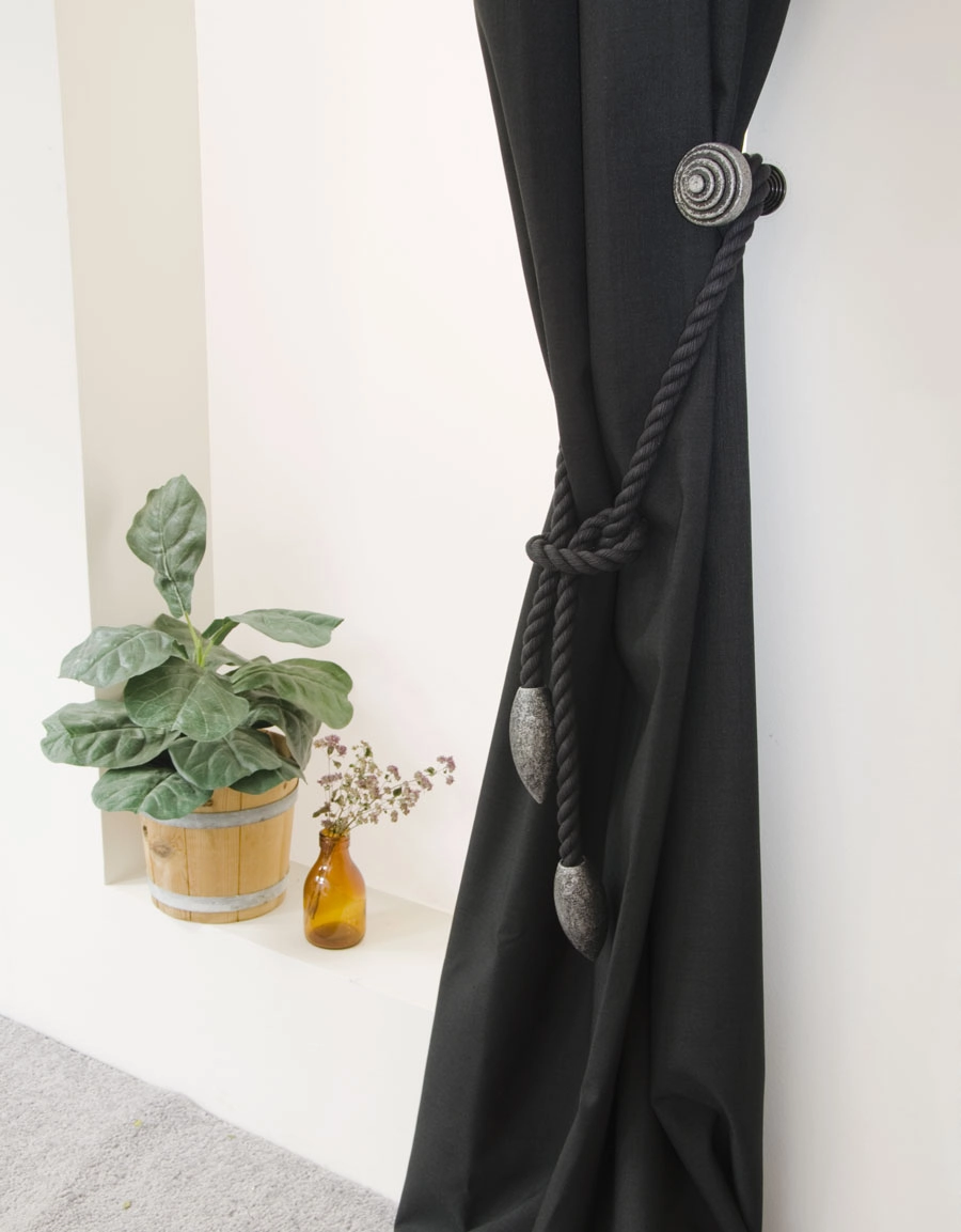 Gardinomtag i bomull. Saga repomtag som finns i svart och i hampa, med olika färger på träovalen.